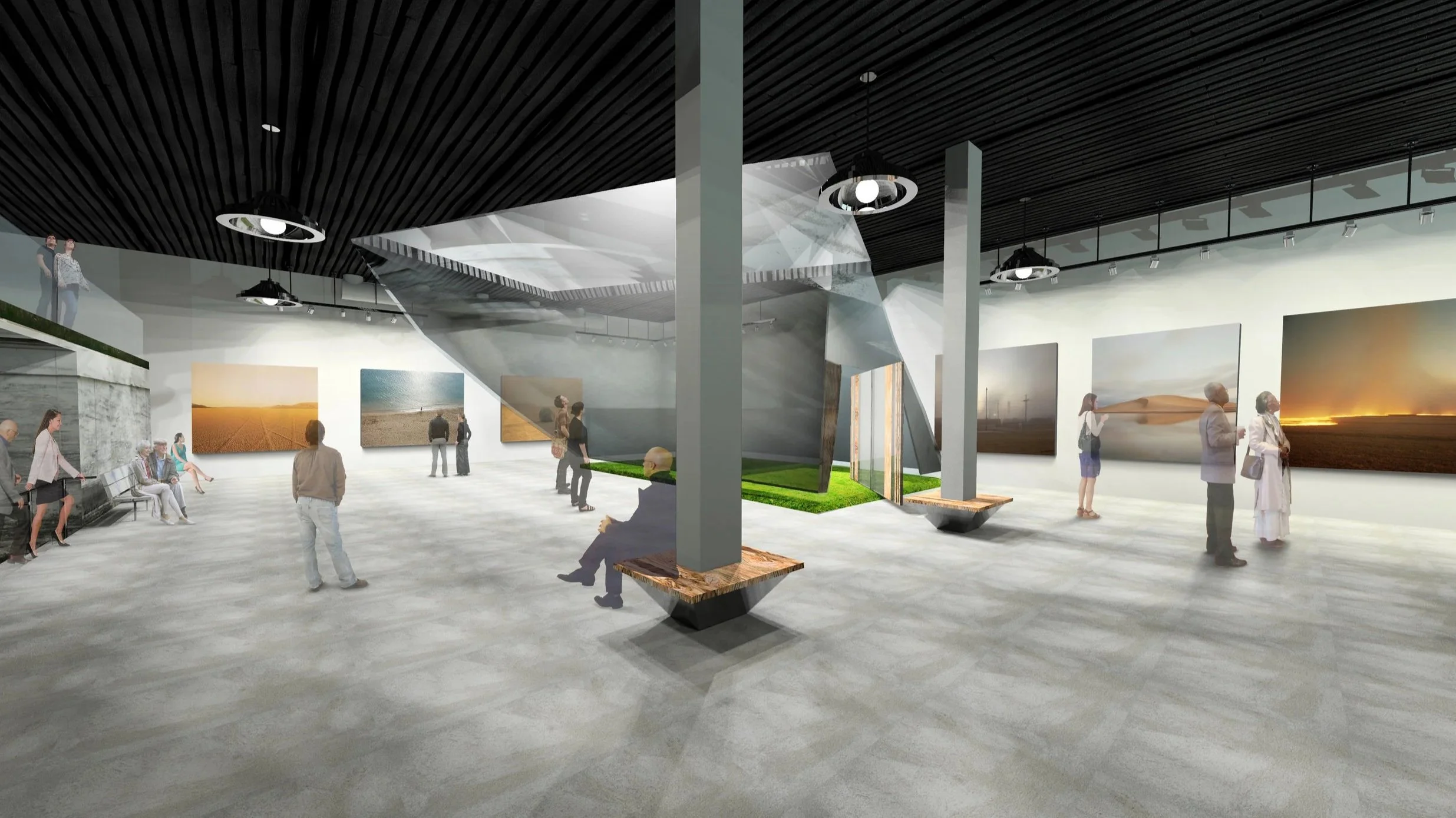 The interior was designed as a tribute to the volunteers on the project. By using leftover and recycled materials. Such as the plywood forms that were used to create the curved surfaces of the ramps. All of these forms were made into a large mural and all remaining pallets and other wood were used to make furniture for the space